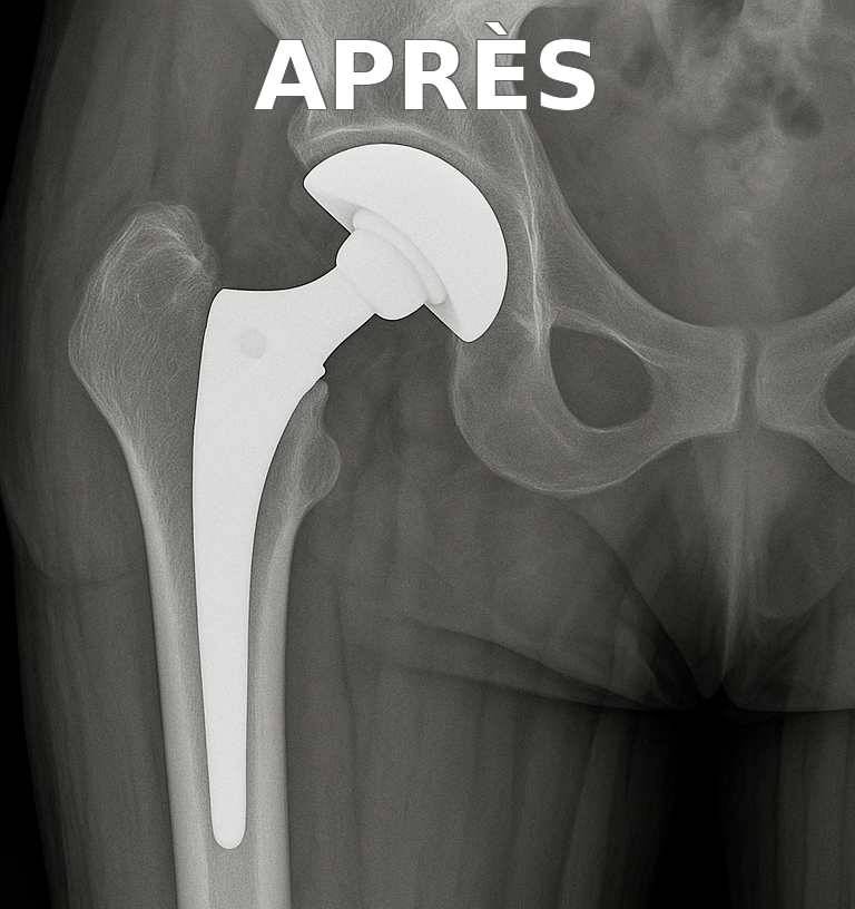 - Prothèse cimentée : Fixation par ciment acrylique, privilégiée chez le sujet âgé ou ostéoporotique